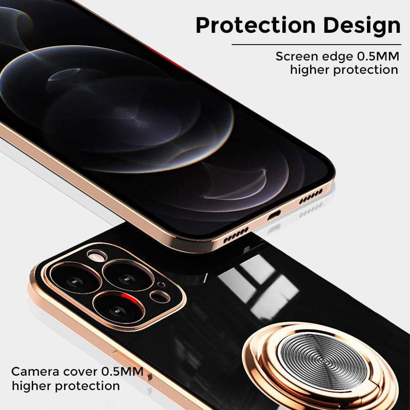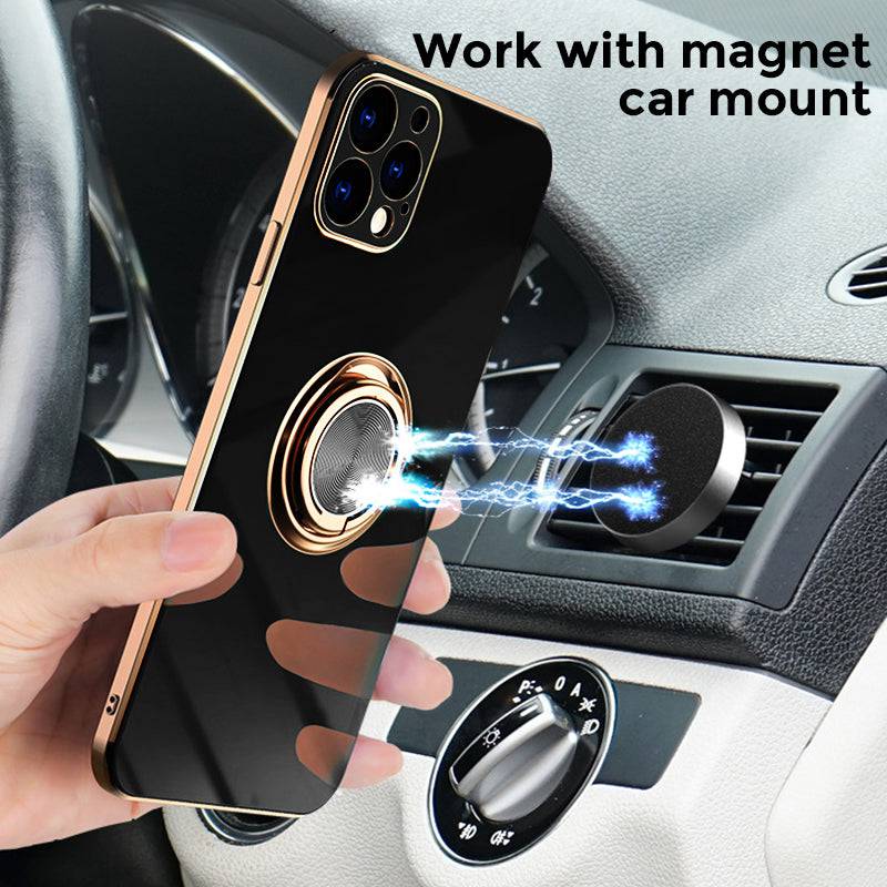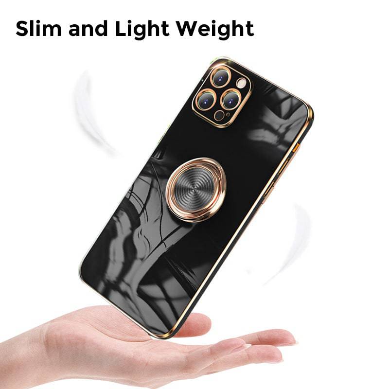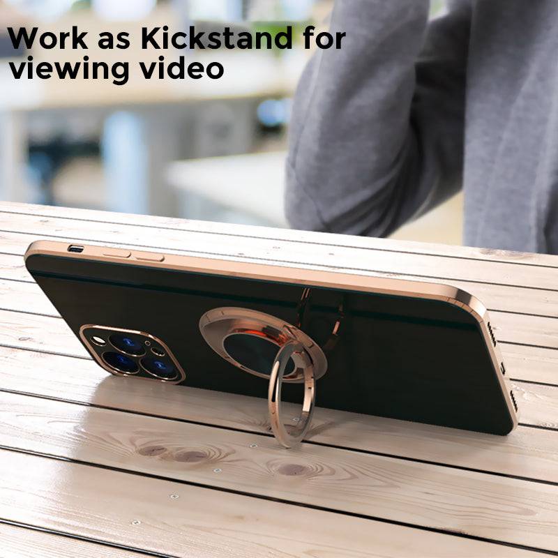 Shiny plating rose gold edge with ring holder design for hands-free viewing, it's convenient for you to watch videos and movies with enviable comfort. The center of the finger holder ring there is a piece of hidden iron, it is easy to connect and remove the phone from the magnetic car mount.