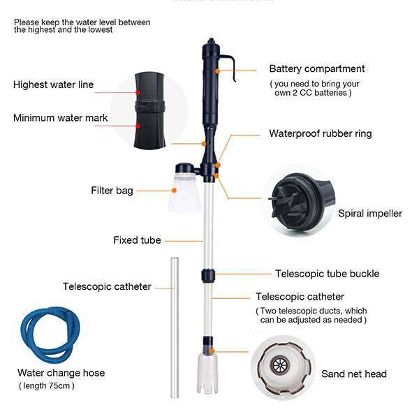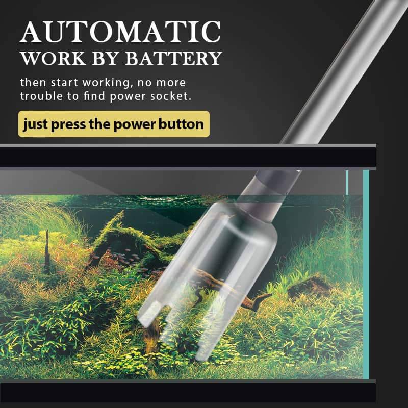 Ao contrário da ferramenta tradicional que requer pressão manual para funcionar, este aspirador de aquário usa 2 baterias (2 C/LR14), basta pressionar o botão liga / desliga e começar a trabalhar, sem mais problemas para encontrar uma tomada elétrica.