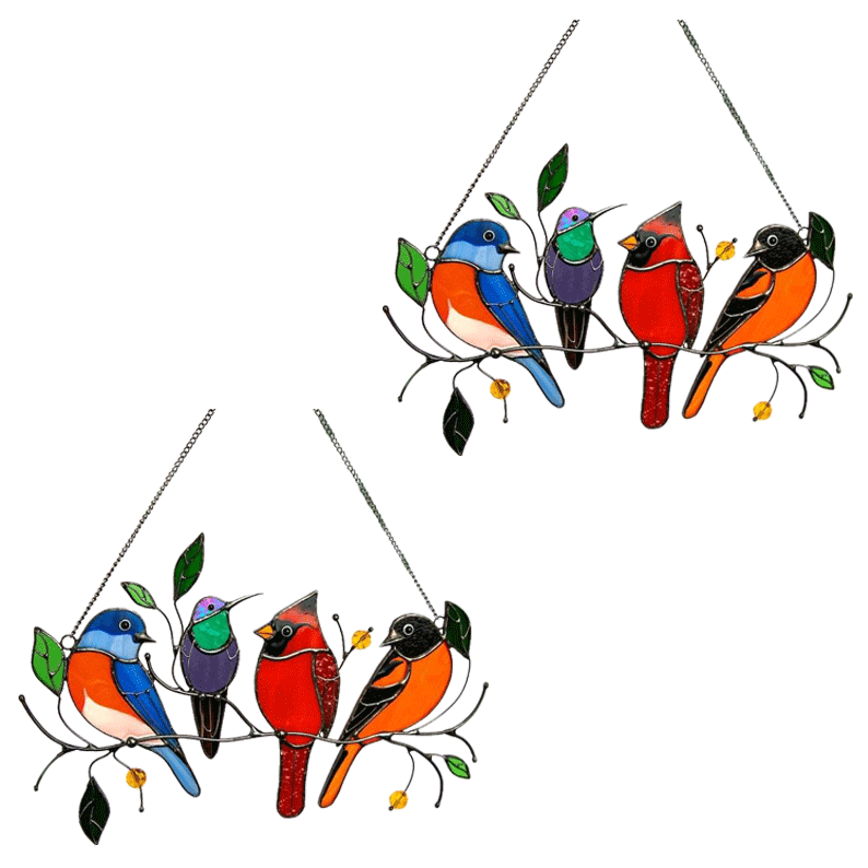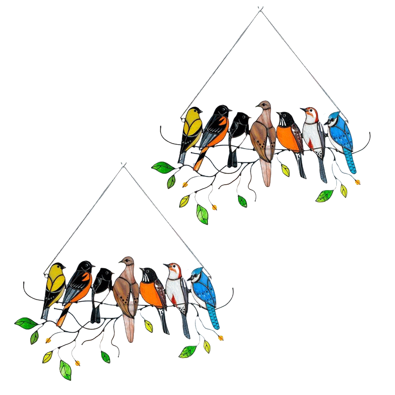 Pássaros pendurados em janelas manchadas